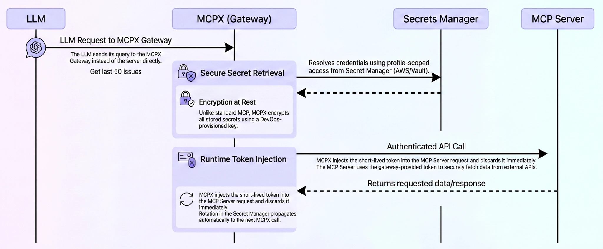 Secret management in MCPX, Lunar's MCP gateway, handles secret management at the protocol layer: