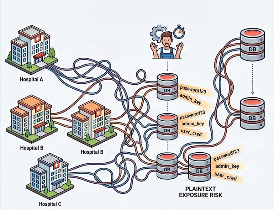 Without governed credential management, the workflow looks like this. An engineer configures the agent manually for each hospital connection. When credentials change, they update each configuration manually. When a new hospital is added, they repeat the process. When a security incident occurs, and credentials need to be rotated, they hope they can find every place those credentials were used before the damage compounds.