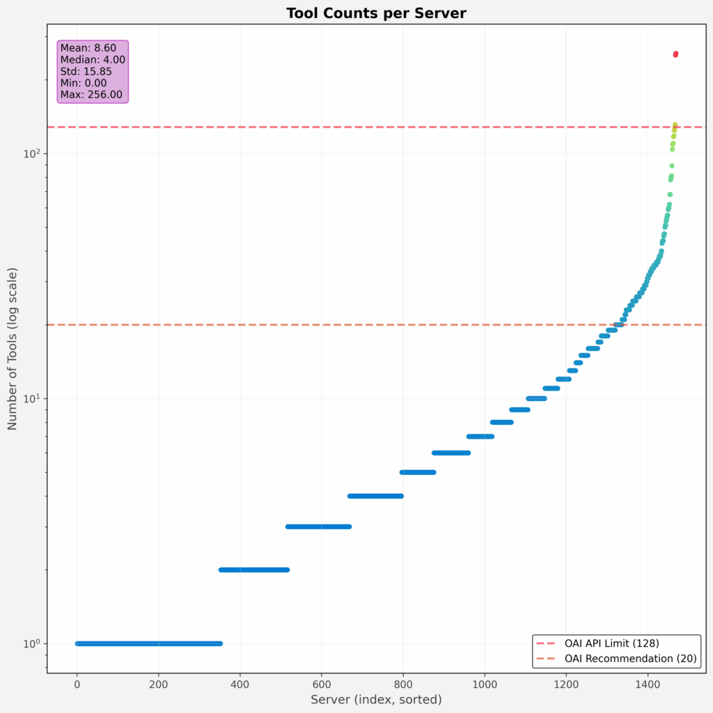 This figure from Tool-space interference in the MCP era: Designing for agent compatibility at scale shows the number of tools listed by each catalogued server directly after initialization.