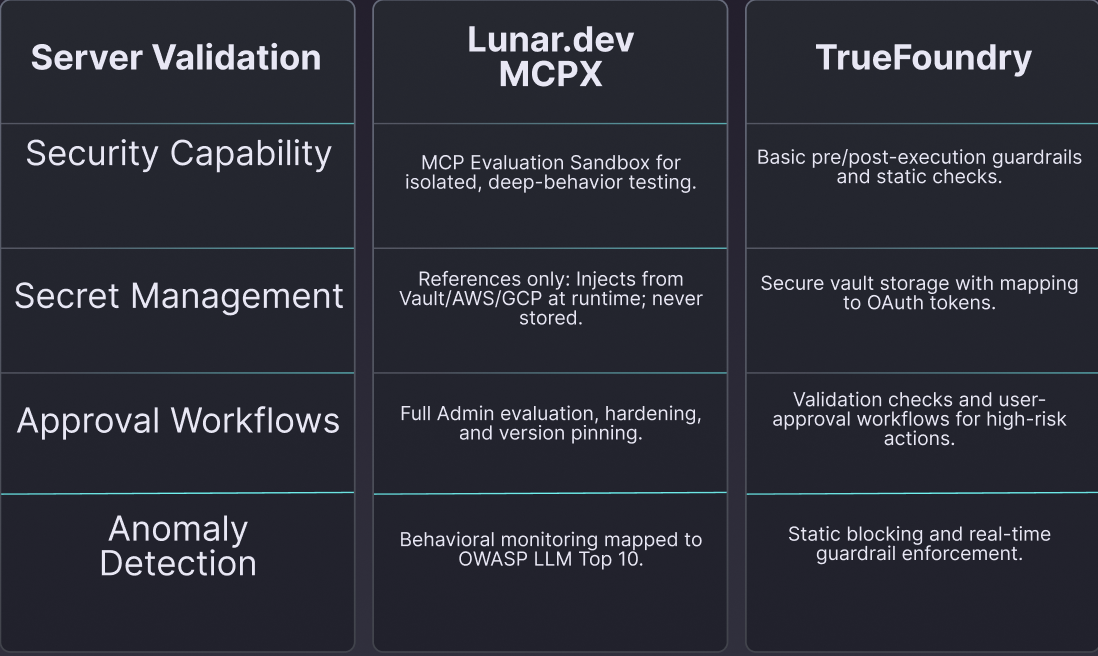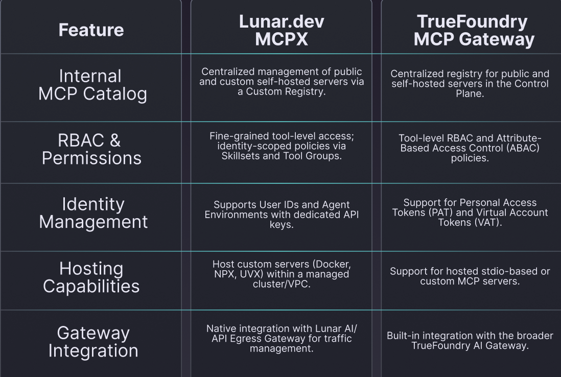 While both Lunar.dev MCPX and TrueFoundry provide foundational connectivity; their architectural philosophies diverge sharply. Strategic decision-makers must distinguish between a platform designed for rapid, UI-driven prototyping and one engineered for high-availability resilience, identity-scoped isolation, and rigorous security governance.