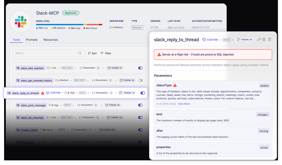 In the Lunar ecosystem, a Skillset acts as the primary container, holding specific Tool Groups and MCP Prompts. This allows architects to build "Financial Analyst" or "DevOps" skillsets that are shared across agents and teams, ensuring consistent, deterministic behavior.In an MCP-enabled environment, the attack surface includes tool poisoning and prompt injection. A security-first mandate is required to operationalize OWASP recommendations through a risk-scoring engine.